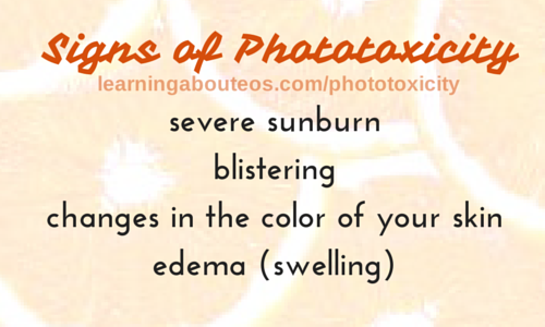 Phototoxicity, or photosensitization, is a reaction caused when essential oils on the skin are exposed to UV light – whether from the sun or from a tanning bed. Reactions can be severe, and even permanent. Here are some of the signs of phototoxicity: