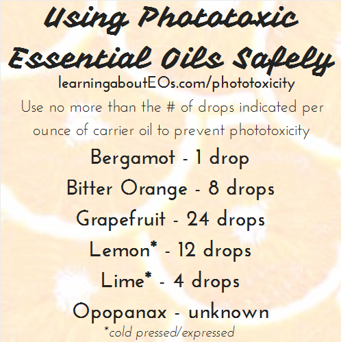 Note: using phototoxic essential oils in a soap or by other means which you wash them off does not put you at risk for phototoxicity. It’s only when they remain on the skin during skin exposure.
