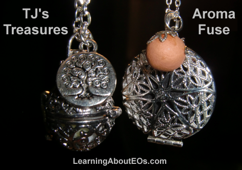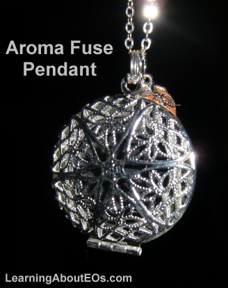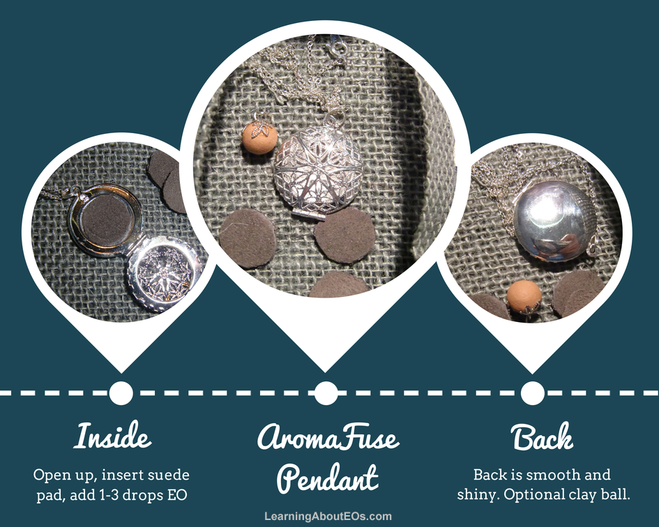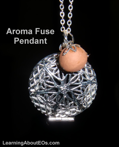 There it is! Although Aroma Fuse offers many options for pendants, this is the one I chose. I am so happy with it! Three suede inserts to apply the EOs on, and Cecilia added in a clay ball accessory for the necklace, as well (EOs can be applied to the clay, too!). Click on photo for a closer look.