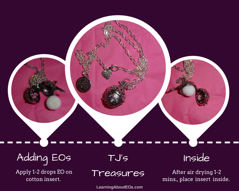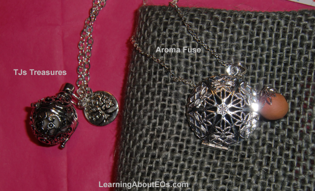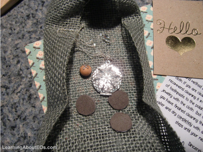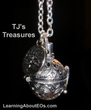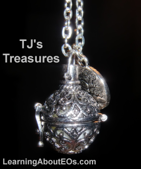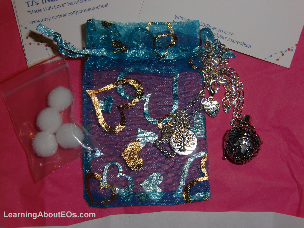 Look at that beautiful pendant! TJ’s Treasures offers many pendants, but this is my favorite. Comes with 4 balls to apply the EOs to. They fit perfectly in the pendant. Do you see the “Hand Made with Love” decoration at the clasp?