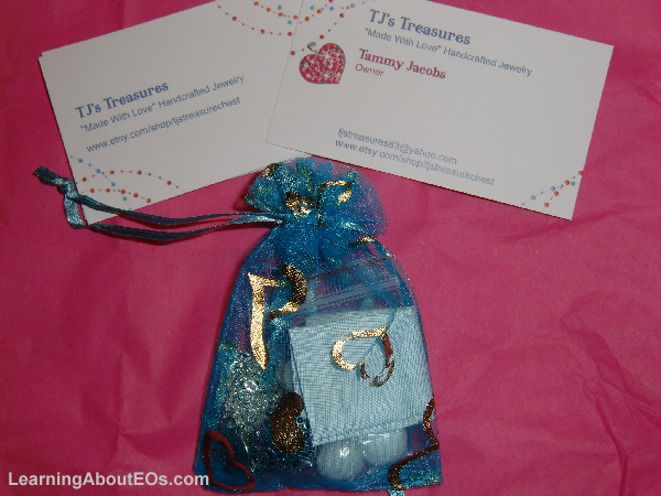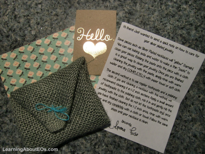 The first package I opened was from Cecilia at Aroma Fuse. A beautiful hand-written note expressing her thanks for our group, a print-out showing how to use and care for the jewelry (click on photo for a zoom-in on these instructions!), and her business card with a shiny gold “Hello” on the back. So cute! The necklace is inside the cool bag you see there! Let’s peek inside….
