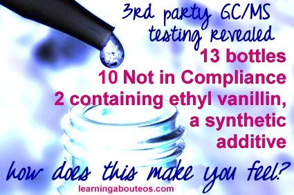 Remember what Plant Therapy did when their Tea Tree was found not in compliance? They chose, on their own, to pull the batch and replace it with a new one. I did not see any company who was tested during our Peppermint round offer to do the same - perhaps they need YOU to contact them and ask them to remove non-ISO compliant batches - especially the ones found to contain a synthetic.
