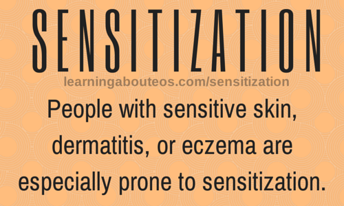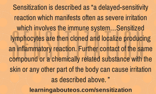 Not many people are aware of the risks for sensitization, sometimes called contact allergic reaction. Sensitization is described as “a delayed-sensitivity reaction which manifests often as severe irritation which involves the immune system…Sensitized lymphocytes are then cloned and localize producing an inflammatory reaction. Further contact of the same compound or a chemically related substance with the skin or any other part of the body can cause irritation as described above. ”